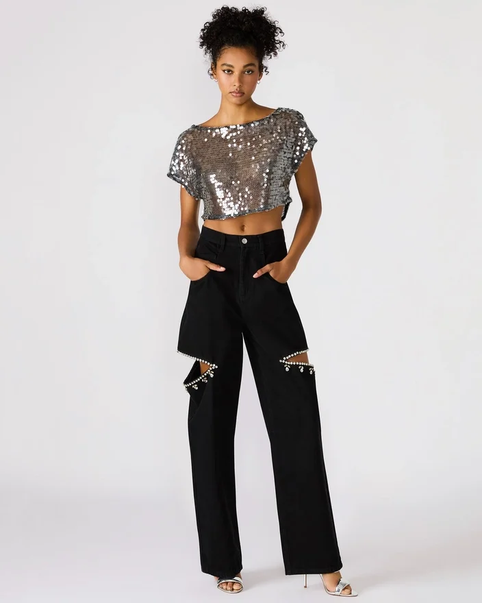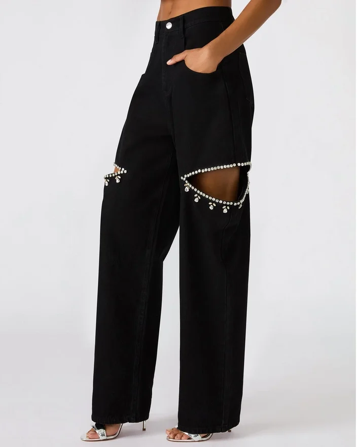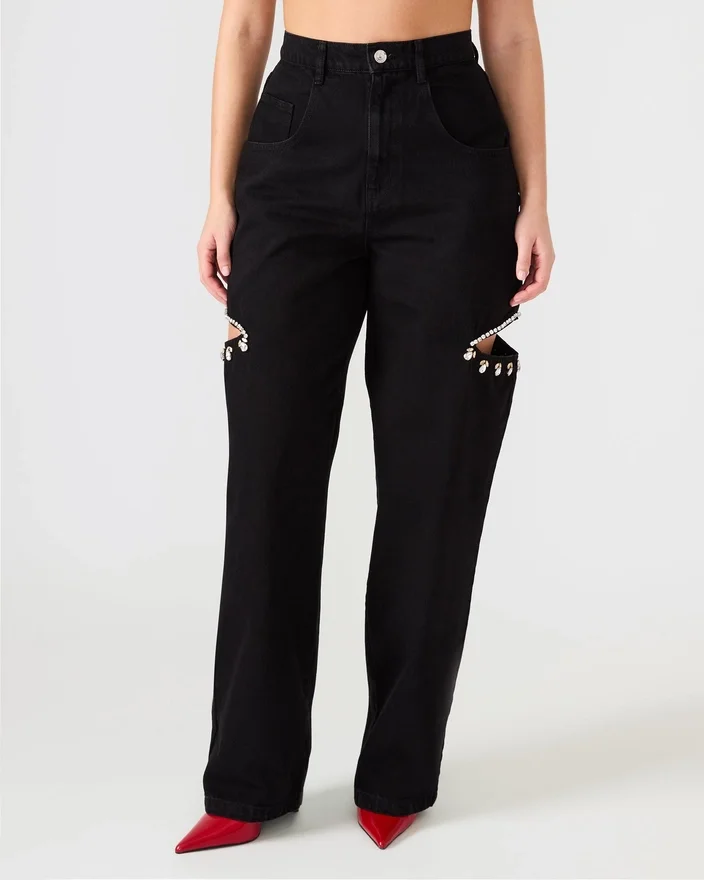 I jeans Ayla neri offrono uno stile intramontabile con un tocco contemporaneo. Realizzati con una silhouette a gamba dritta che valorizza la figura, questi jeans presentano spacchi impreziositi da strass che aggiungono un tocco di glamour al design classico. Chiusi con una chiusura affidabile con bottone e cerniera, offrono sia sicurezza che praticità. Le tasche funzionali anteriori e posteriori offrono spazio pratico senza compromettere l’estetica elegante.