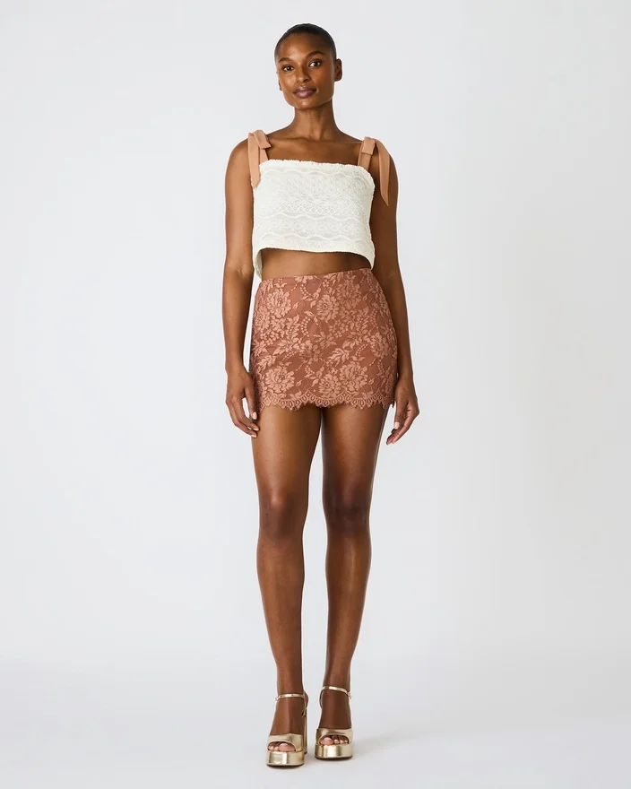 Migliora il tuo look da sera con la gonna Cindi Mocha Heather. Questa gonna presenta un design interamente in pizzo. Offre un completo coordinato e alla moda, perfetto per occasioni speciali o serate fuori. La gonna ha una finitura lussuosa e un fascino fluido e accattivante, pur mantenendo una vestibilità disinvolta.