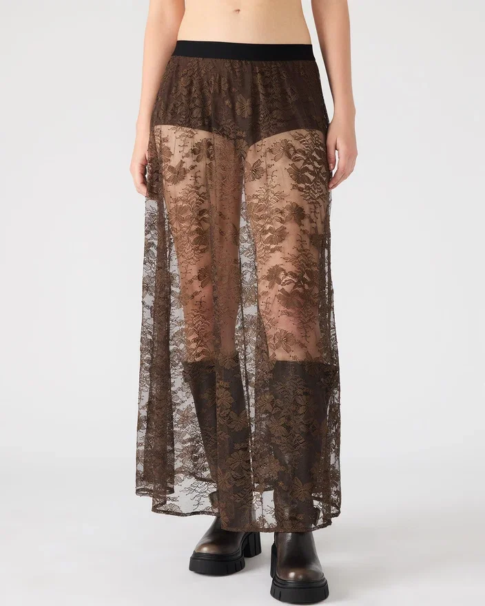 Arricchisci il tuo guardaroba con la gonna Gisela, una gonna lunga in pizzo trasparente che unisce eleganza e raffinatezza moderna.