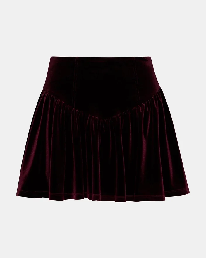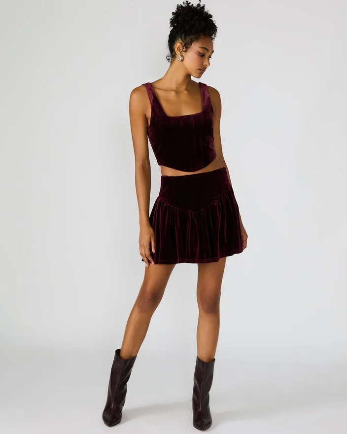 Arricchisci il tuo guardaroba con la gonna Jayla color vino, una minigonna fluida in velluto progettata per un’eleganza disinvolta. Questo capo si abbina perfettamente al set coordinato, offrendo un look armonioso e lussuoso, perfetto per le occasioni speciali o per un look quotidiano alla moda.