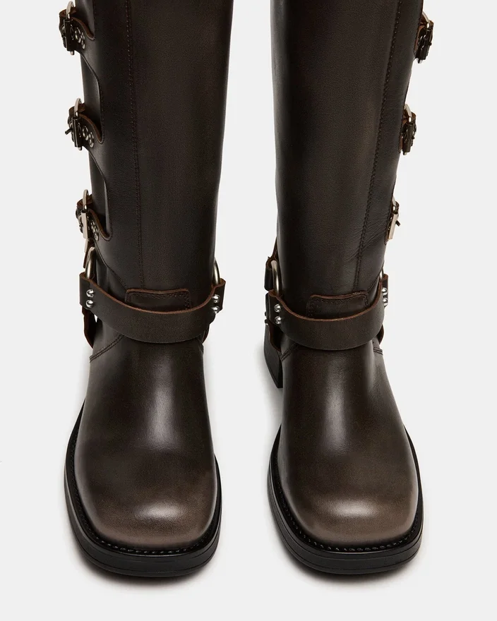Gli stivali al ginocchio Rocky Brown in pelle invecchiata a polpaccio largo presentano il profilo ampio tipico degli stivali da ingegnere, con fibbie e cinturini che conferiscono un tocco industriale e garantiscono una vestibilità regolabile.
