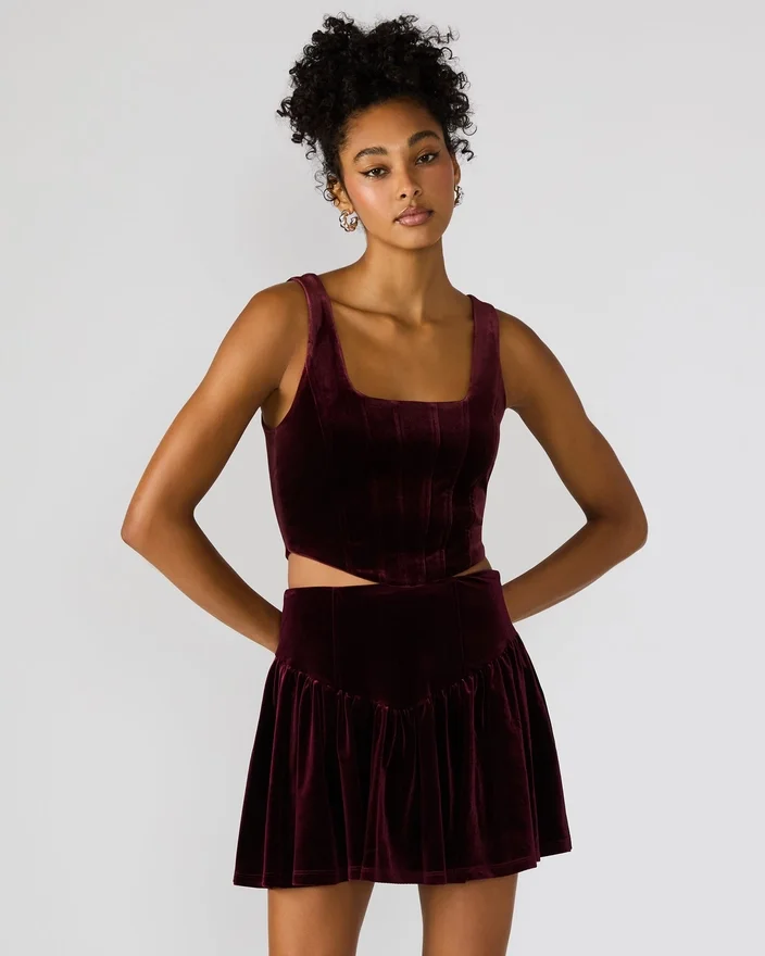 Arricchisci il tuo guardaroba con il top Aryanna Wine, un top corto senza maniche in velluto progettato per unire stile e comfort. Caratterizzato da un’elegante chiusura con cerniera sul retro, garantisce una vestibilità sicura valorizzando al contempo la silhouette. Perfetto come capo di punta o abbinato al set coordinato, questo top promette una texture lussuosa e un look raffinato e moderno, ideale per ogni occasione sofisticata.