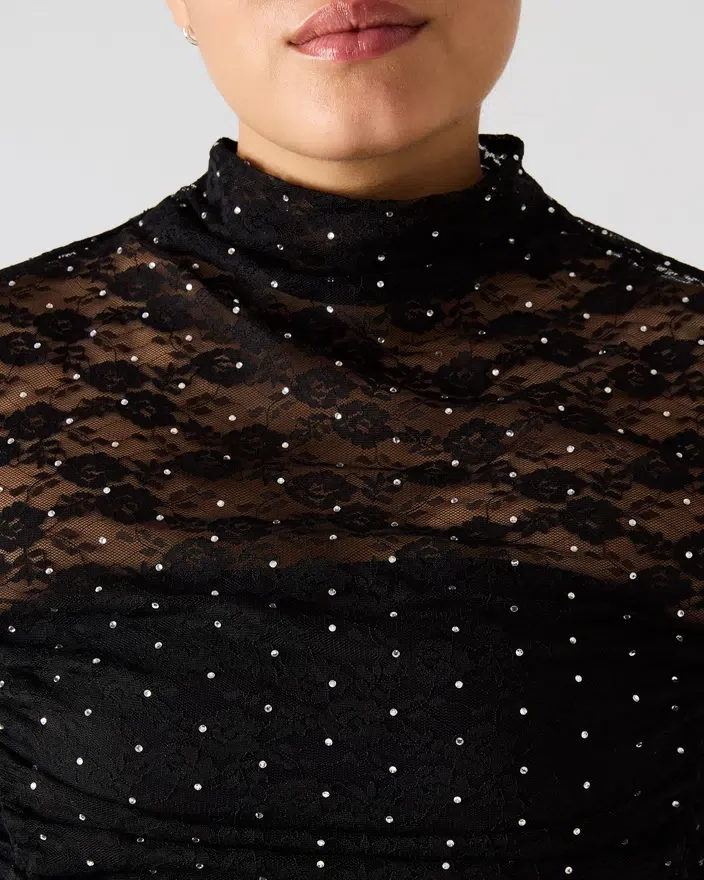 Il top Baylee nero presenta un sofisticato design a maniche lunghe in rete combinato con una silhouette a collo alto, offrendo sia eleganza che un tocco di grinta. Realizzato per garantire traspirabilità e un look moderno e aderente, questo top è ideale per essere indossato in sovrapposizione o per creare un look di tendenza da solo. Il suo tessuto in rete trasparente migliora il comfort aggiungendo una texture contemporanea che si abbina a vari outfit con grande versatilità.