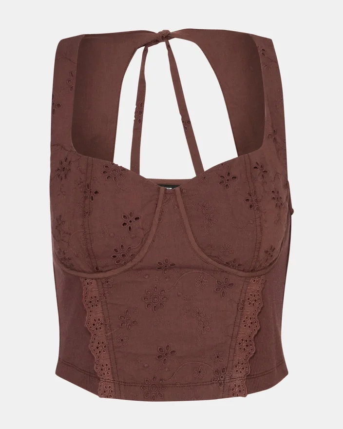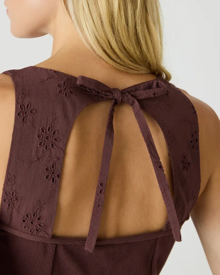 Il top in maglia Dixie Walnut offre una raffinatezza disinvolta grazie alla sua silhouette senza maniche e ai delicati dettagli traforati. Un taglio strategico sulla schiena abbinato a un laccio regolabile crea un effetto visivo interessante e consente uno styling versatile: indossalo in modo elegante per le occasioni serali o in modo casual per un look informale. Perfetto da indossare da solo o in sovrapposizione, questo capo si adatta magnificamente a tutte le stagioni.