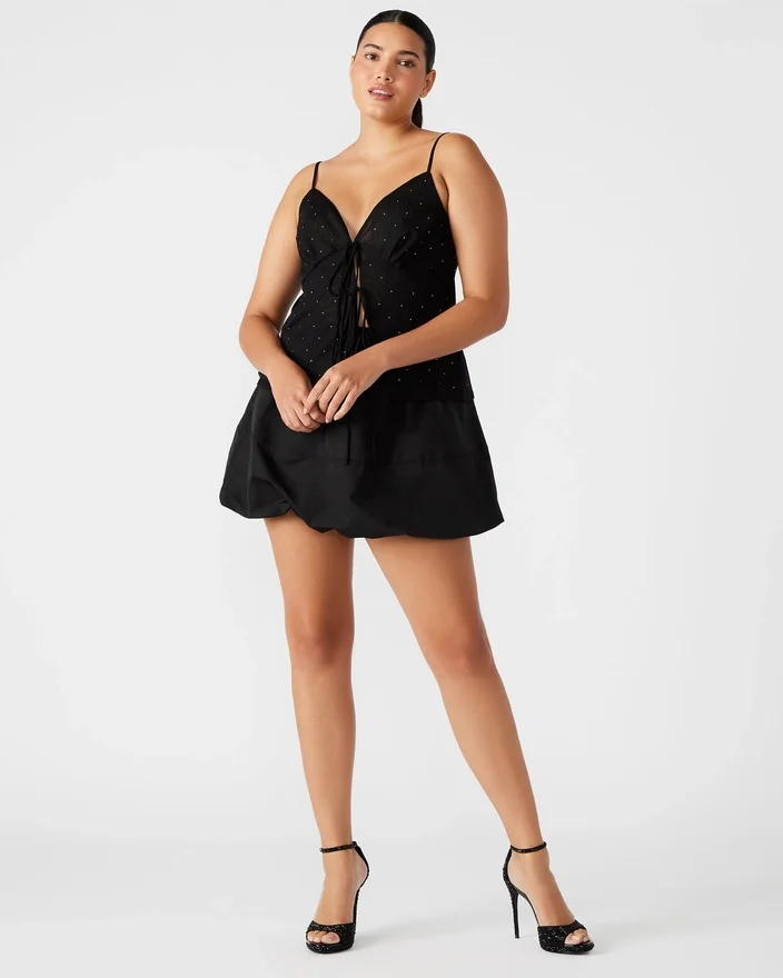 Vi presentiamo il top Indy, un elegante top a canotta con un raffinato design allacciato sul davanti e delicati mini strass. Le spalline regolabili garantiscono una vestibilità perfetta, rendendolo un capo indispensabile per qualsiasi guardaroba alla moda.