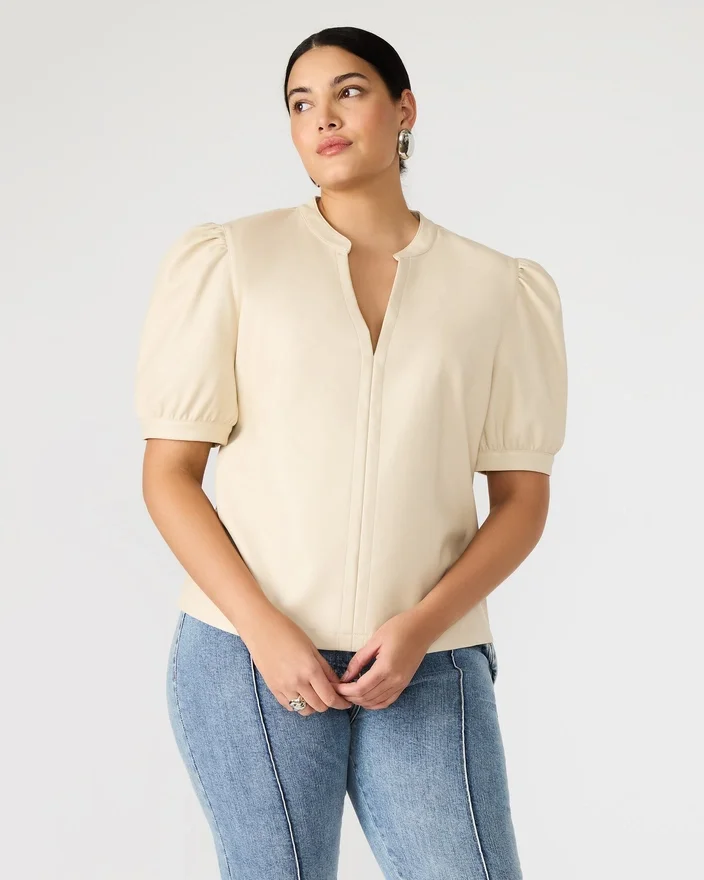 Il top Jane vanta un design contemporaneo con un tocco di femminilità. Il suo morbido tessuto in ecopelle conferisce struttura a questo modello a maniche corte a sbuffo. Il collo a V con spacco e le spalle a sbuffo a mezza lunghezza completano il suo look elegante e raffinato.