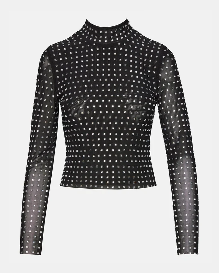 Il top Melvina è una scelta sofisticata e versatile per qualsiasi guardaroba. Con un elegante collo alto e maniche lunghe, questo top offre sia copertura che stile. Il delicato tessuto a rete trasparente aggiunge un tocco di eleganza, mentre le decorazioni con strass a forma quadrata conferiscono un tocco sottile ma glamour. Perfetto per ogni occasione, questo top è un must-have per chiunque sia attento alle tendenze della moda.