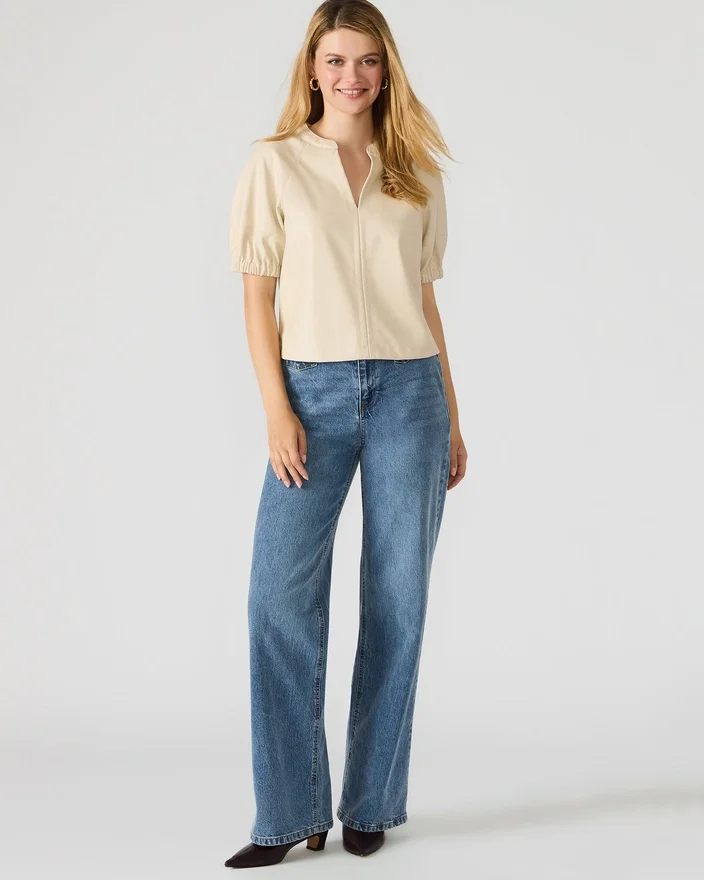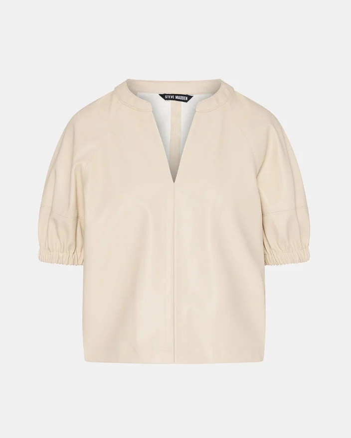 Arricchisci il tuo guardaroba con il top Roxanne, caratterizzato da maniche a sbuffo corte realizzate in lussuosa ecopelle. Questo capo dal design raffinato combina una texture audace con una silhouette che valorizza la figura, perfetto per un look sofisticato in ogni occasione.