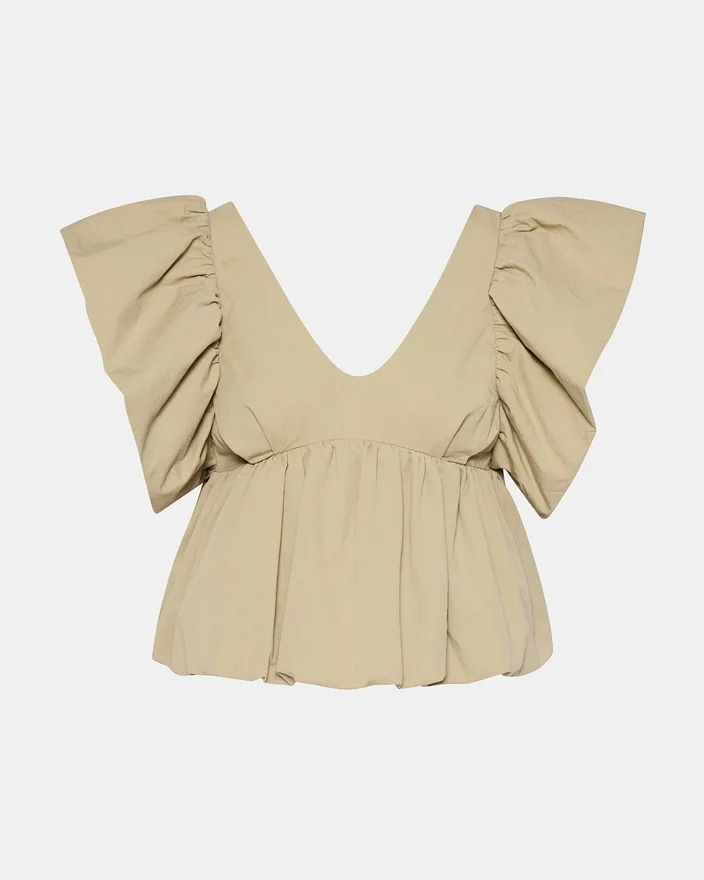 Il top Saskya color kaki presenta un’elegante scollatura a V abbinata a un peplo in vita che aggiunge volume e movimento. Le maniche oversize con volant creano un look audace e di grande effetto, perfetto sia per il giorno che per la sera. Ideale per dare un tocco di classe a un outfit Casual o per vestirsi eleganti in occasioni speciali.