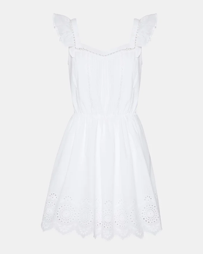 Arricchisci il tuo guardaroba primaverile con il vestito Astra. Questo miniabito in voile di cotone traforato presenta affascinanti spalline con bordi a volant e delicati dettagli in pizzo.