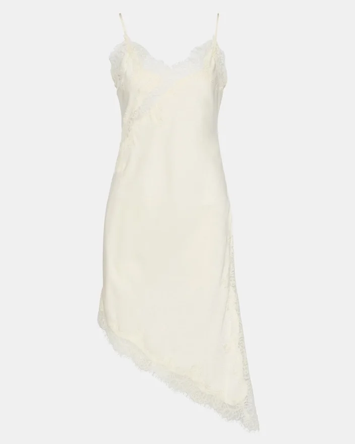 L’abito Danna color crema combina un’eleganza disinvolta con dettagli di design moderni. Questo abito senza maniche a vita media presenta un delicato bordo in pizzo che aggiunge una texture raffinata, mentre il taglio asimmetrico crea un effetto visivo interessante e movimento. Le spalline regolabili assicurano una vestibilità su misura per tutte le corporature.