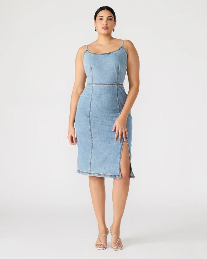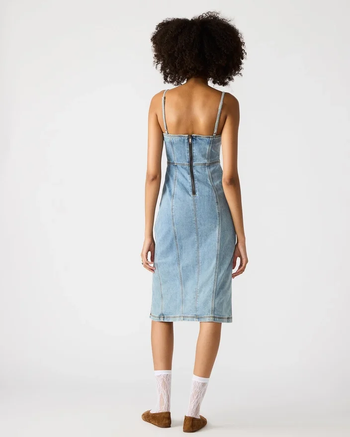 Rinnova il tuo guardaroba con il vestito Giselle. Questo vestito midi aderente presenta spalline regolabili e una chiusura con cerniera a vista sul retro per una vestibilità perfetta. Realizzato in denim blu di alta qualità, questo vestito è sia elegante che comodo.