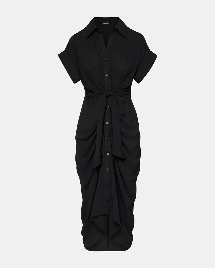 Il vestito Tori presenta un colletto arrotolato e maniche corte con risvolto, con una vita arrotondata regolabile con laccio sul davanti e un orlo asimmetrico.