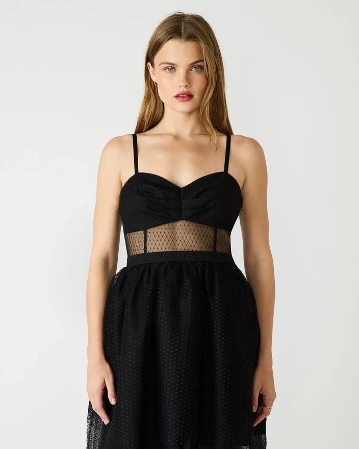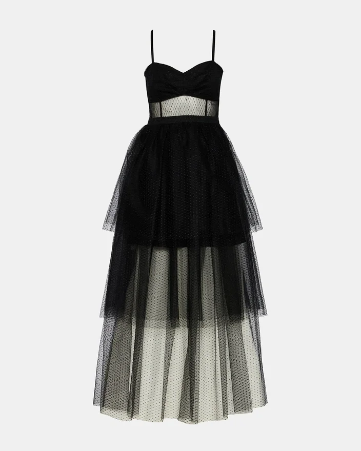 Fai il tuo ingresso con questo sofisticato abito nero in tulle Emily, progettato con un elegante pannello centrale in rete che aggiunge interesse visivo e dimensione. Le spalline regolabili offrono una vestibilità personalizzabile, permettendoti di trovare la tua silhouette perfetta per la serata. Realizzato in tulle di alta qualità, questo abito offre il volume e il movimento che ci si aspetta da un capo formale mozzafiato. Ideale per balli di fine anno, serate di gala o qualsiasi occasione formale in cui l’eleganza senza tempo è fondamentale.