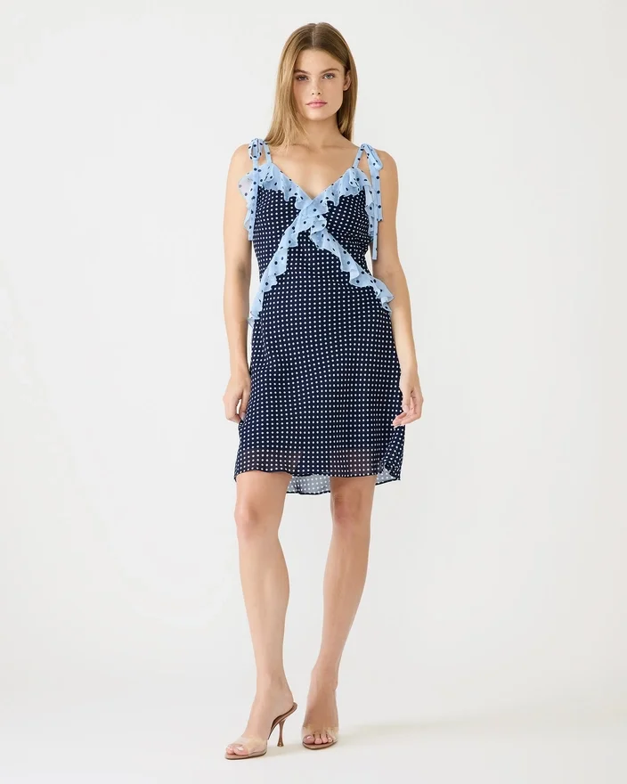 Il miniabito Adalina Vintage Navy unisce il fascino vintage a uno stile contemporaneo. Questo capo presenta vivaci dettagli a pois e delicati volant che creano movimento e volume. La silhouette fluida cade magnificamente, mentre le spalline regolabili con lacci aggiungono un tocco elegante e sofisticato. Perfetto per le occasioni in cui si desidera bilanciare la fantasia con la raffinatezza, questo vestito passa senza sforzo dall’abbigliamento da giorno a quello da sera.<!–