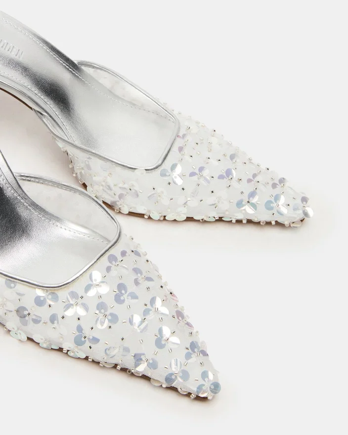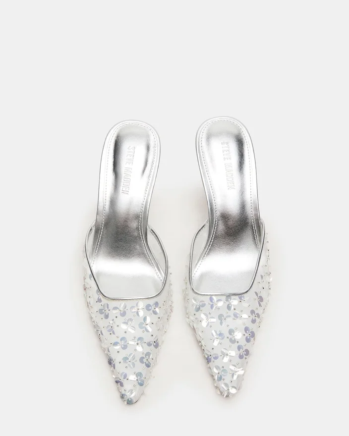 Arricchisci la tua collezione di calzature con il modello Alexi Sequin Silver, un sofisticato sabot con punta affusolata. Realizzato con finiture di alta qualità, questo modello versatile unisce uno stile contemporaneo a un comfort che garantisce una camminata agevole.