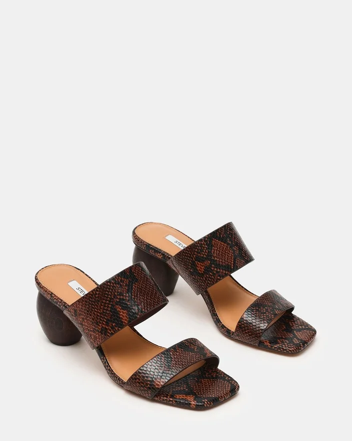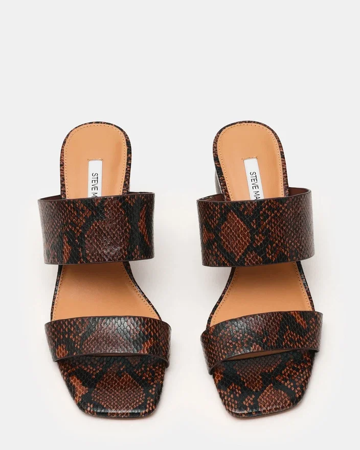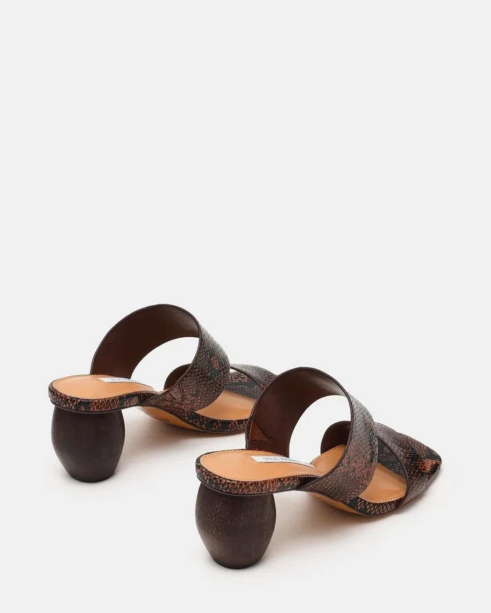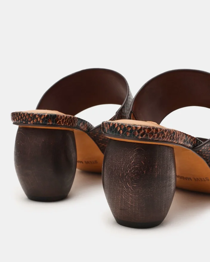 Entra in uno stile disinvolto con il modello Nola Brown Snake. Questo moderno sabot presenta una caratteristica punta squadrata e un robusto tacco largo per garantire comfort e stabilità per tutto il giorno. I cinturini spessi e di sostegno mantengono il piede ben saldo, offrendo al contempo un look audace e contemporaneo. Perfetto per passare dal giorno alla sera con il minimo sforzo.