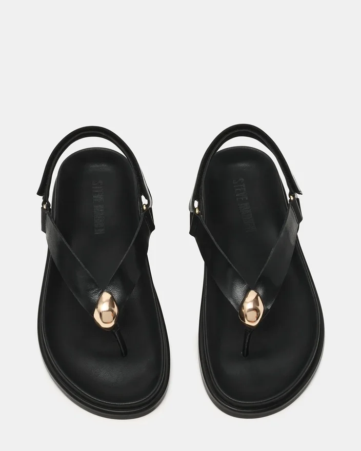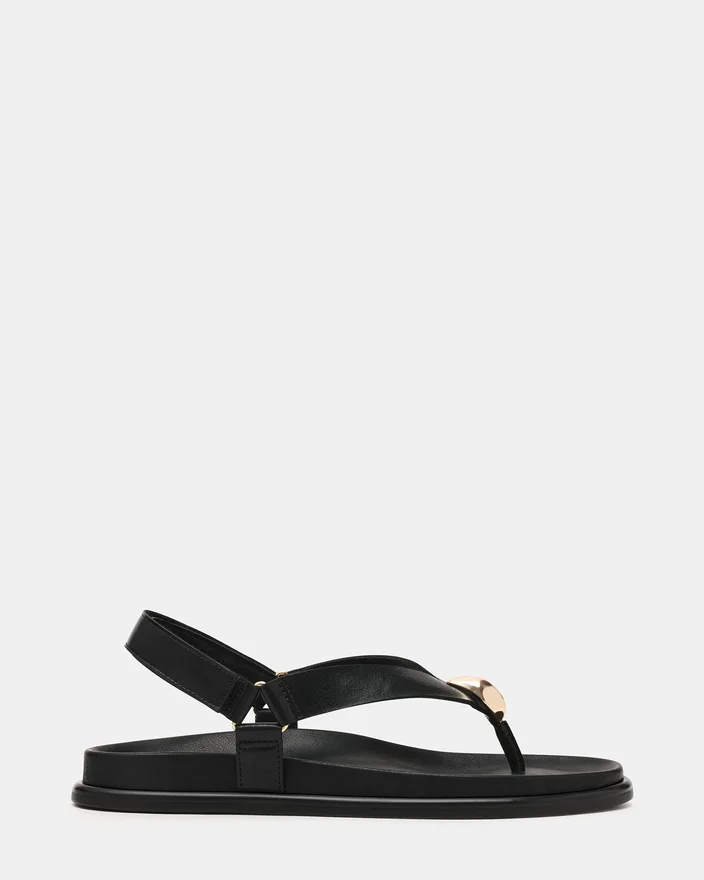 L’eleganza disinvolta incontra il comfort quotidiano con il sandalo infradito Elvia in pelle nera, progettato con un cinturino Slingback di sostegno che mantiene il piede ben saldo per tutta la giornata. Il plantare sagomato offre sostegno all’arco plantare e ammortizzazione per un uso quotidiano, mentre i delicati dettagli dorati aggiungono un tocco finale raffinato. Perfetto per passare da uscite Casual a serate rilassate, questo modello versatile combina un design pratico con una raffinatezza sobria.
