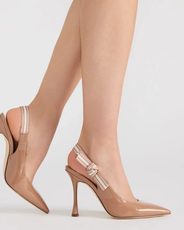 Un nastro in gros-grain avvolge il cinturino posteriore delle décolleté con tacco a spillo e punta affusolata Bri e termina con un fiocco che impreziosisce il lato della scarpa.