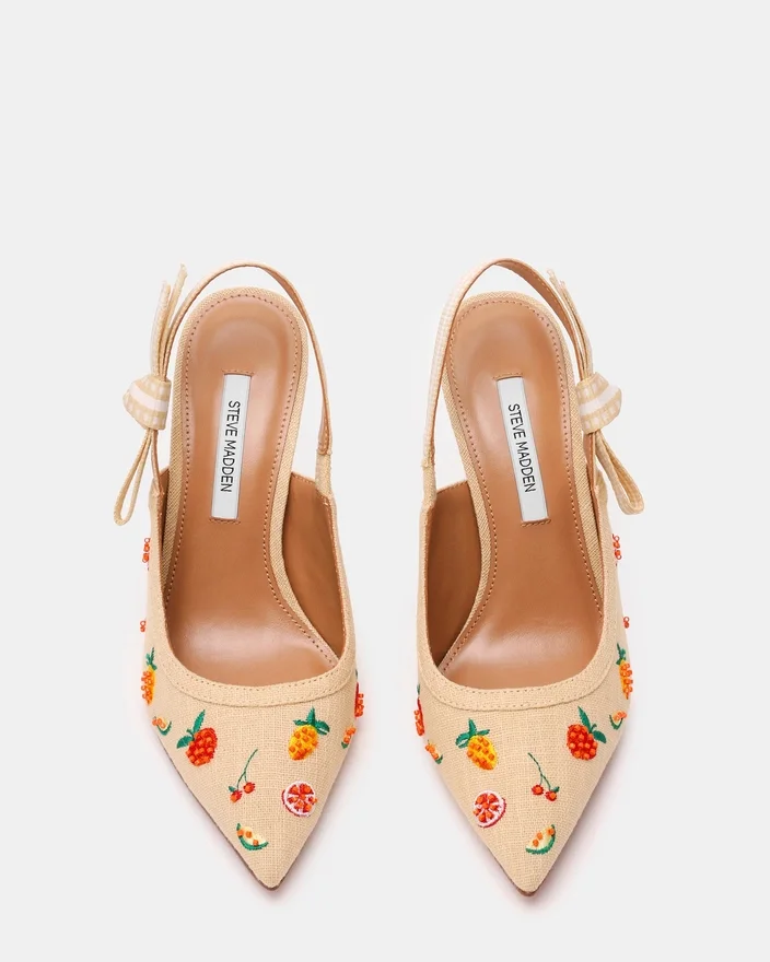 Un nastro in gros-grain avvolge il cinturino posteriore delle décolleté con tacco a spillo e punta a punta Bri Raffia Fruit Multi e termina con un fiocco che impreziosisce il lato della scarpa.