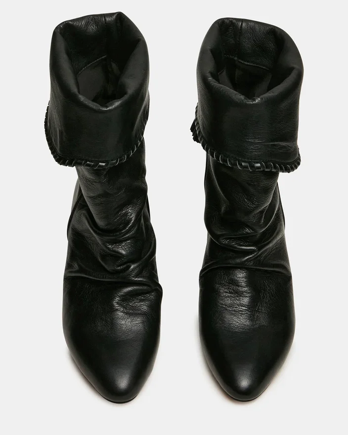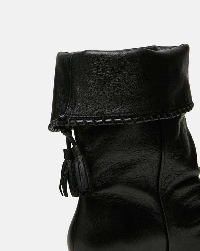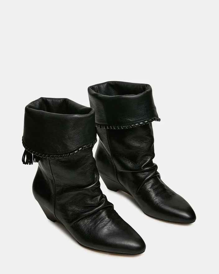 Gli stivaletti con zeppa in pelle nera Enaya combinano la raffinatezza architettonica con dettagli ricercati. La silhouette a punta slancia la gamba, mentre il design arricciato aggiunge texture e interesse visivo. Il dettaglio con nappina offre un tocco finale raffinato che valorizza qualsiasi outfit.