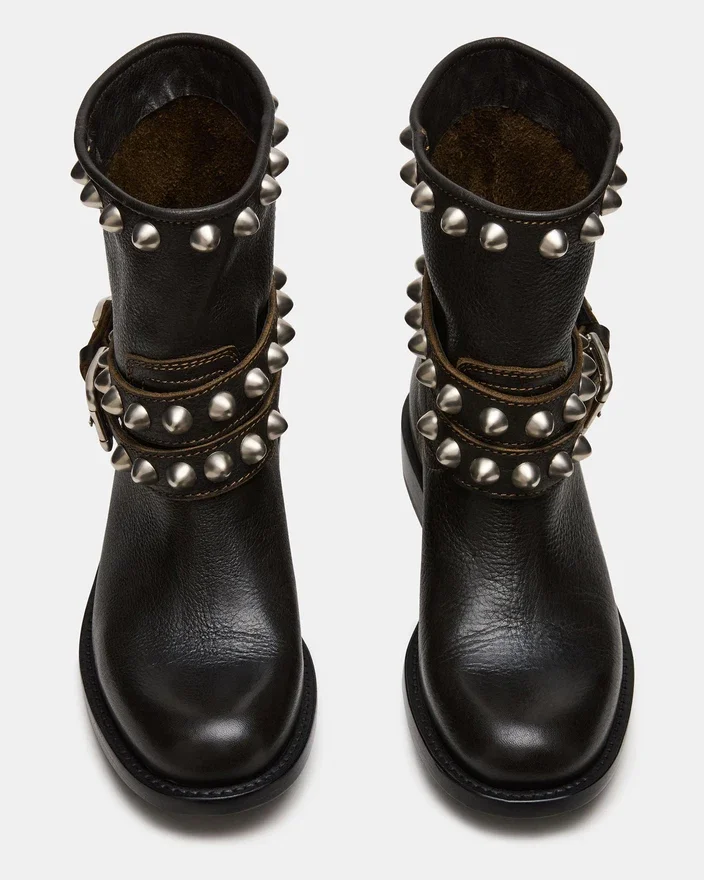 Lo stivaletto Orbit Black Distressed combina un design audace ispirato al mondo delle moto con raffinati dettagli in borchie dorate. Caratterizzato da una robusta fibbia, questo stivaletto offre una calzata sicura ed esalta il tuo stile con una sottile nota di grinta. La sua finitura invecchiata aggiunge carattere, rendendolo una scelta versatile per un look moderno e audace.