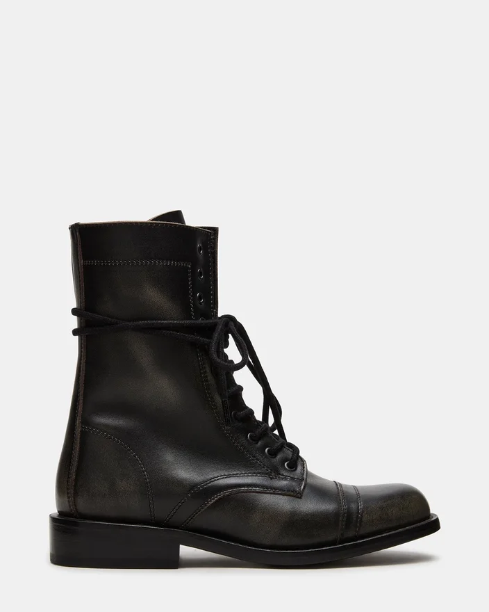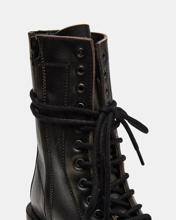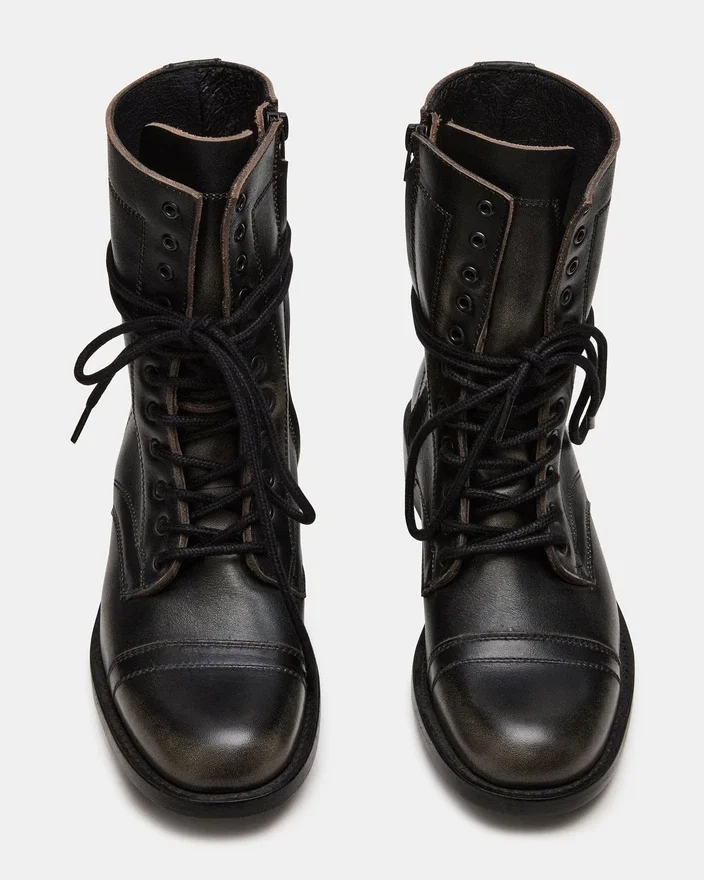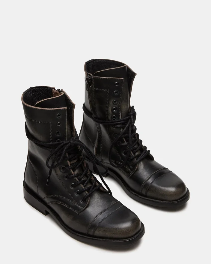 Lo stivaletto da combattimento Theron Black Distressed con lacci combina uno stile robusto con una struttura resistente. Progettato per un uso affidabile, questo stivaletto presenta una finitura invecchiata che aggiunge un tocco di grinta a qualsiasi outfit. Il design con lacci garantisce una calzata personalizzata, mentre la suola robusta offre trazione e sostegno adatti alle avventure quotidiane.