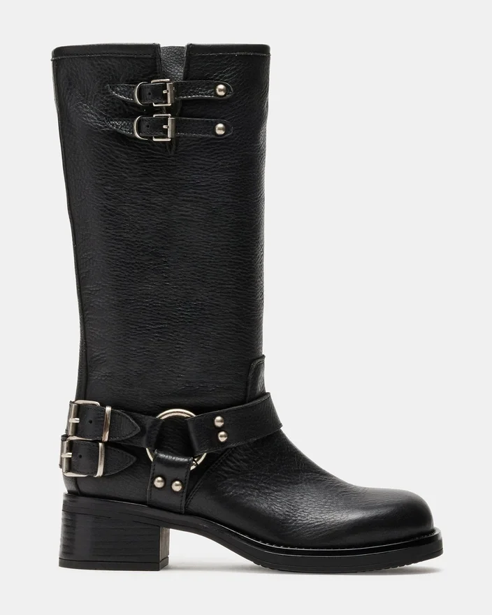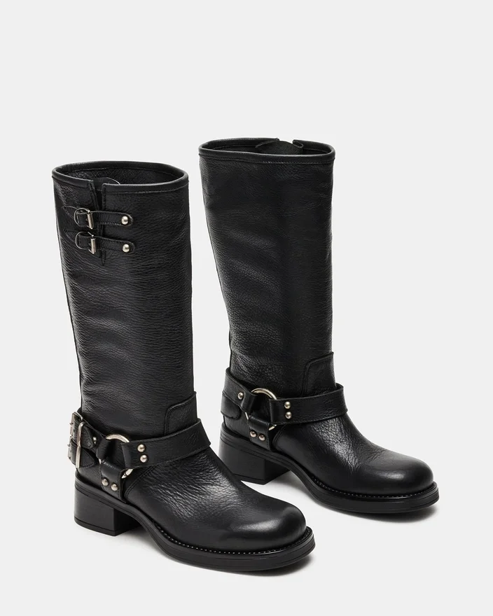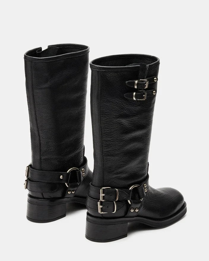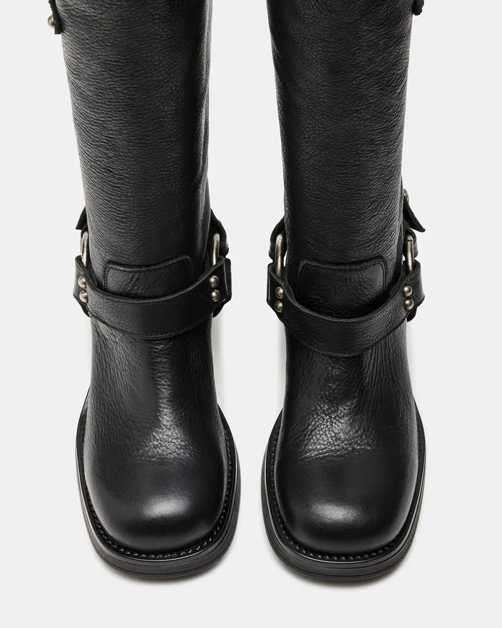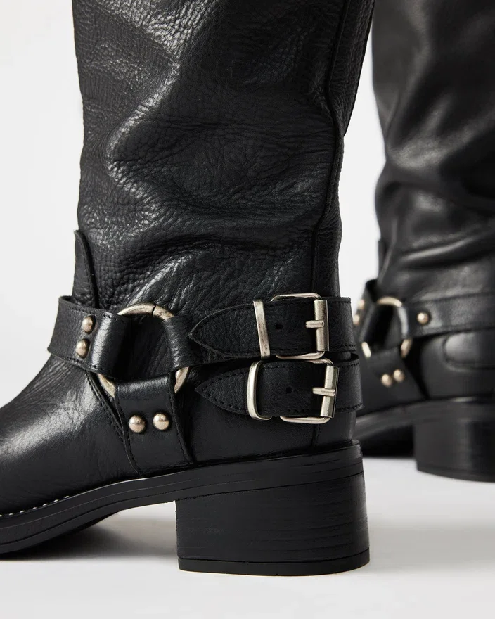 Gli stivali Astor a punta quadrata presentano una silhouette morbida a metà polpaccio, rinforzata da dettagli a cinturino e robuste fibbie. Una suola larga con tacco a blocco fornisce una solida base per questo design ispirato agli stivali da ingegnere.