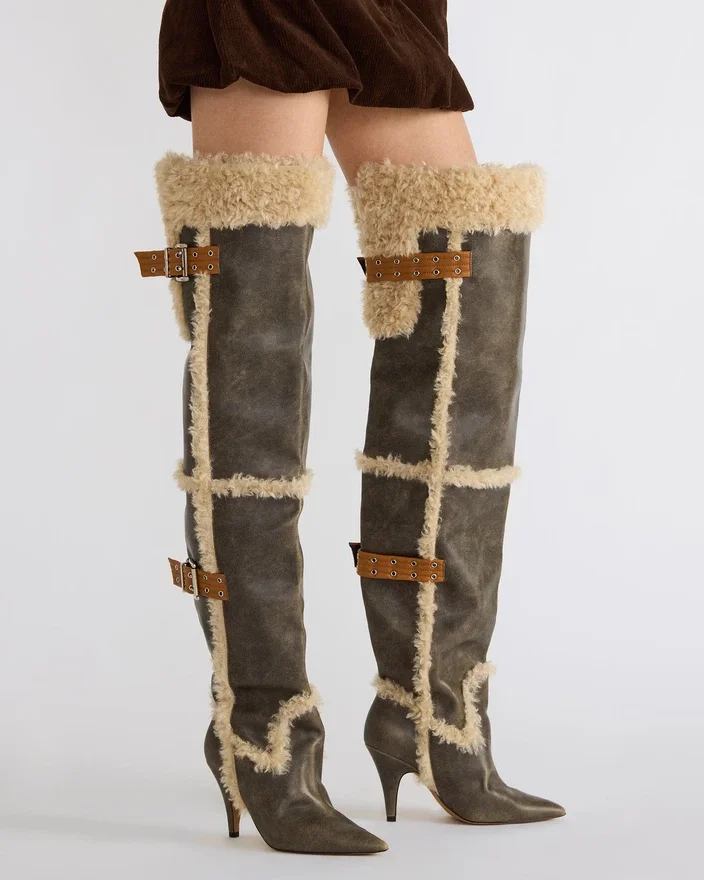 Realizzati con maestria, gli stivali Baddie in pelliccia sintetica marrone effetto invecchiato sono sia audaci che pratici. Caratterizzati da punta affusolata e dettagli con fibbia, questi stivali sopra il ginocchio con scarpe col tacco offrono un tocco unico a qualsiasi outfit. Esalta il tuo stile con questi stivali di tendenza.