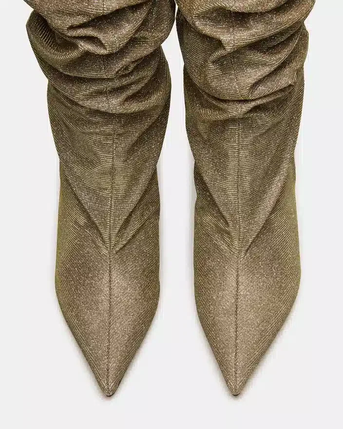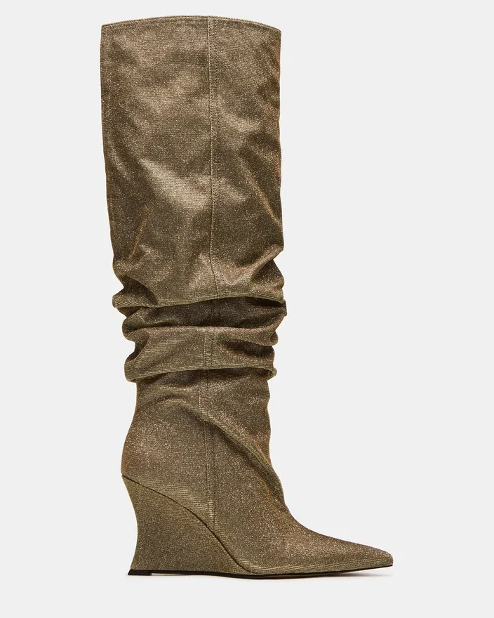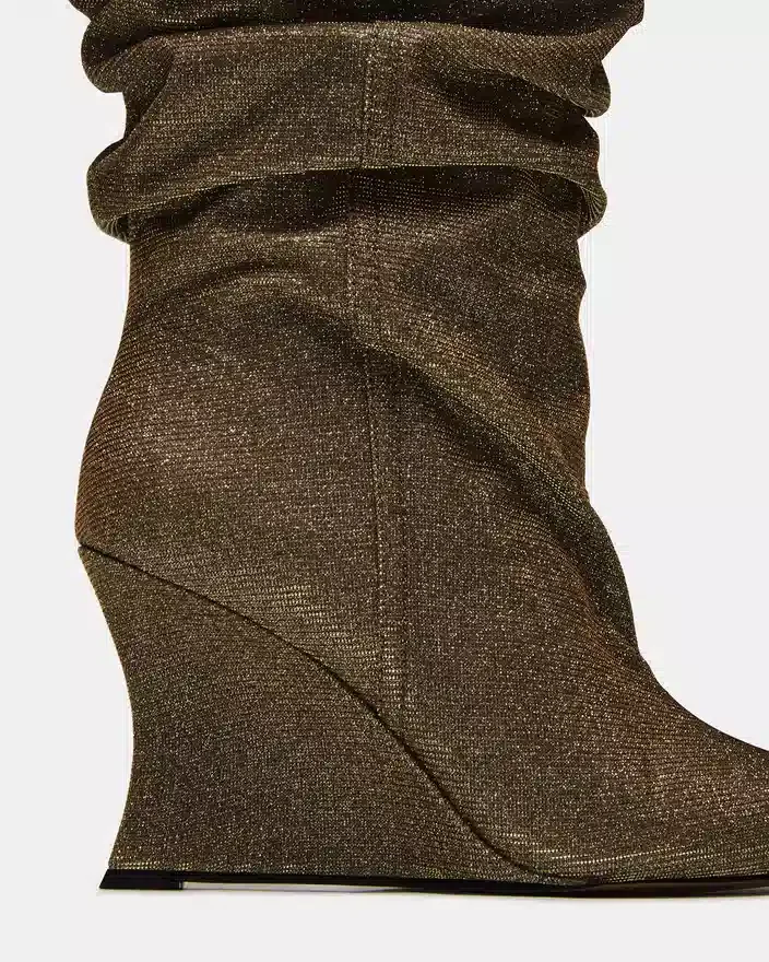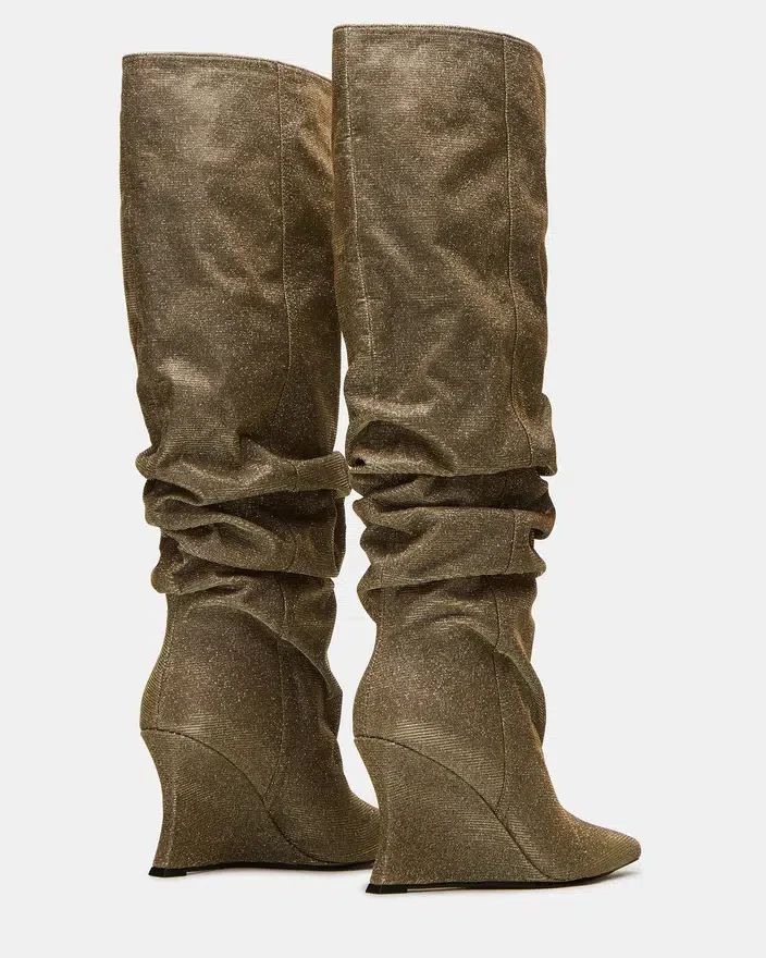 Lo stivale Distortion Gold Glitter presenta un design arricciato, scarpe col tacco e punta affusolata, che arriva all’altezza del ginocchio per una silhouette audace e all’avanguardia. Realizzato per combinare uno stile grintoso con il comfort, questo stivale valorizza qualsiasi outfit con il suo design elegante e il caratteristico supporto a zeppa. Ideale per chi cerca un capo di tendenza che bilancia moda e praticità.