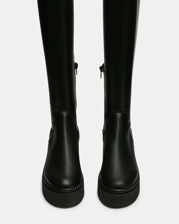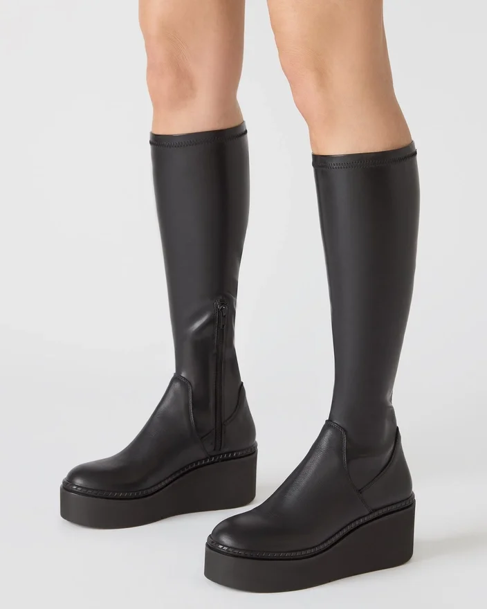 Questo stivale al ginocchio Draco Black combina un design architettonico con una funzionalità pratica. La punta arrotondata crea una silhouette raffinata, mentre la base con plateau offre un’altezza e un comfort migliorato per un uso prolungato. Realizzato con precisione artigianale, offre l’estetica raffinata e il supporto strutturale che valorizzano qualsiasi guardaroba.