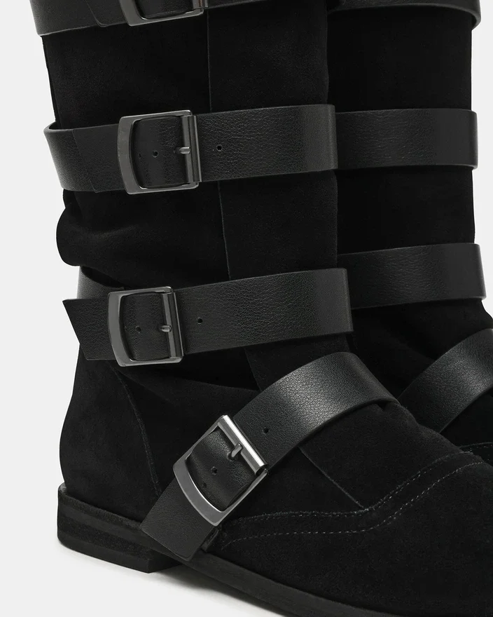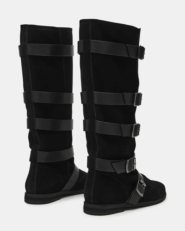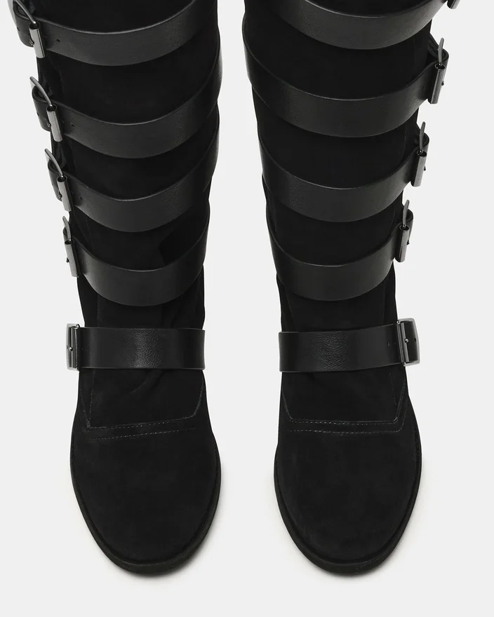 Lo stivale Indio in pelle scamosciata nera incarna un design senza tempo con la punta arrotondata e i dettagli del cinturino con fibbia. Questi cinturini conferiscono un look unico, aggiungendo profondità visiva alla silhouette. Arrivando all’altezza del ginocchio, questo stivale offre una copertura estesa e una presenza imponente che esalta qualsiasi outfit.