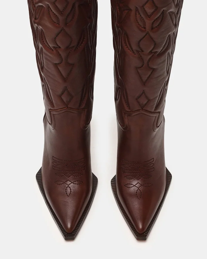 Il Kinzee in pelle marrone offre uno stile Western con un tocco moderno. Questo stivale al ginocchio presenta una punta affilata e un tacco a spillo imponente che slancia la gamba. Realizzato con materiali di prima qualità, questo modello offre una silhouette elegante che si abbina facilmente a tutto, dal denim ai vestiti, per un look di grande effetto.