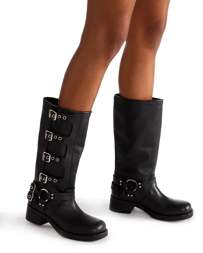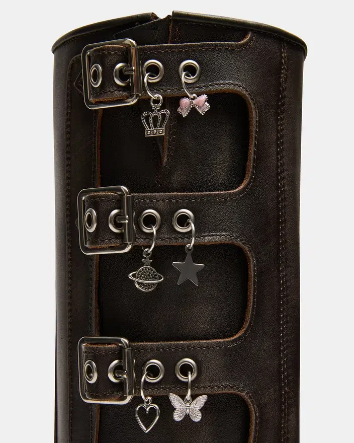 Gli stivali al ginocchio Rocky Charms Brown Distressed presentano il profilo ampio tipico degli stivali da ingegnere, con dettagli in metallo quali fibbie e cinturini che conferiscono un tocco industriale e garantiscono una vestibilità regolabile.