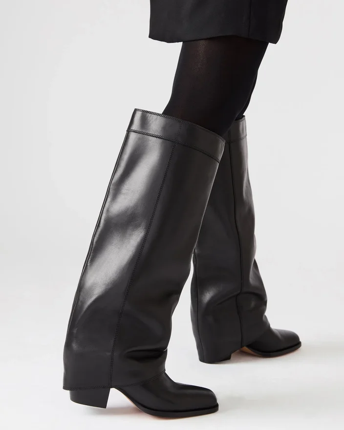 Arricchisci la tua collezione di calzature con gli stivali Winnick in pelle verde oliva, caratterizzati da un sofisticato design con risvolto che arriva al ginocchio per un look di grande impatto. Realizzati con una moderna punta squadrata e sostenuti da un robusto tacco a blocco, questi stivali combinano stile e stabilità, rendendoli ideali da indossare tutto il giorno.