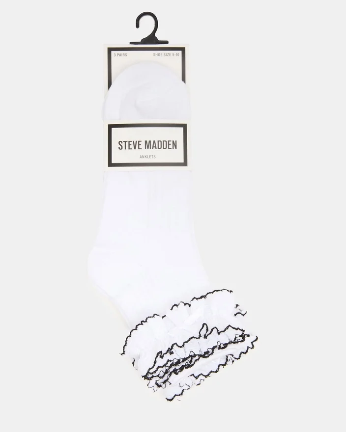 Arricchisci il tuo cassetto dei calzini con questa versatile confezione da 2 paia di calzini Ava con volant bianchi. Ogni paio presenta affascinanti doppi volant e un tessuto bianco brillante impreziosito da rifiniture nere per un look raffinato e alla moda. Il design con volant aggiunge texture e personalità a qualsiasi outfit, mentre la classica combinazione di colori garantisce un facile abbinamento con il tuo guardaroba esistente. Perfetti da indossare con le Sneakers o da mettere in mostra con i Mocassini, questi calzini offrono sia stile che comfort per l’uso quotidiano.