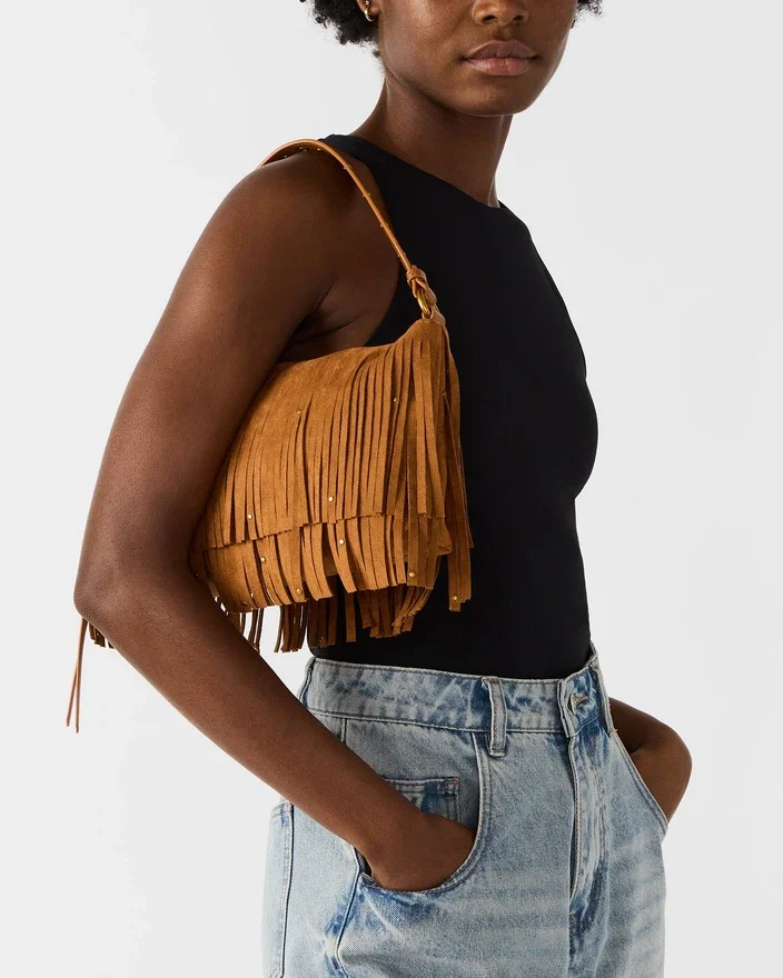 Scopri il mix perfetto di stile e funzionalità con la nostra borsa Boheme con tracolla in tabacco. Il design con frange aggiunge un tocco bohémien, mentre la tasca interna e la chiusura con cerniera superiore garantiscono una comoda organizzazione e una conservazione sicura. Migliora il tuo look con questo accessorio indispensabile.