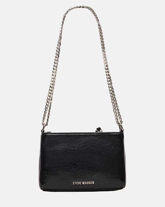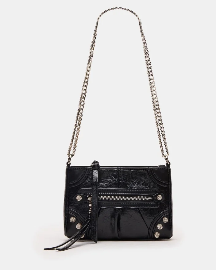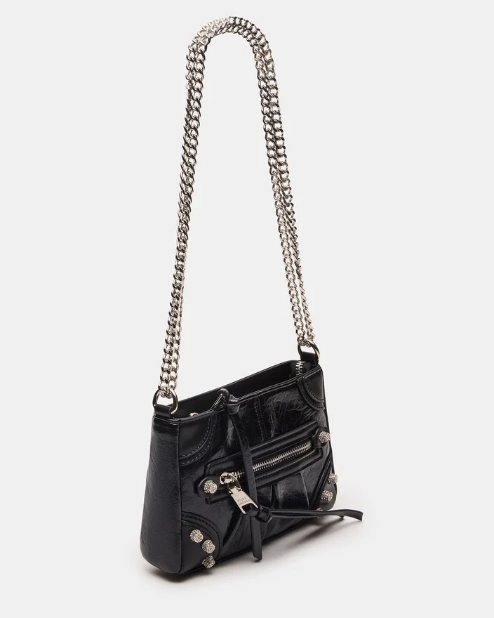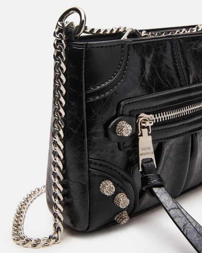 Questa Mini Sky Bag Nero/Argento è una borsa a tracolla di ispirazione motociclistica che combina un design audace con dettagli raffinati. Caratterizzata da un elegante corpo nero impreziosito da scintillanti borchie di strass, aggiunge un tocco di glamour a qualsiasi outfit. La tracolla a catena offre sia resistenza che un sofisticato contrasto, rendendola un accessorio ideale per la comodità di avere le mani libere senza rinunciare allo stile. Perfetta per trasportare l’essenziale con un tocco moderno e all’avanguardia.<!–